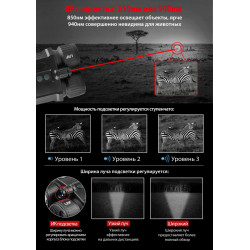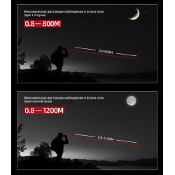 Бинокль оснащён 16-мегапиксельной CMOS-матрицей с чувствительностью 0,002 люкс, что позволяет получать чёткое изображение даже при минимальном освещении. Встроенный ИК-осветитель с тремя уровнями мощности помогает видеть в полной темноте на расстоянии до 300 метров, а при лунном свете — до 1200 метров. Цветные OLED-дисплеи с разрешением 1024x768 обеспечивают комфортное наблюдение при любых условиях.