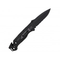 Лезвие ножа имеет комбинированную заточку, включающую гладкий и серрейторный участки. Это позволяет эффективно справляться с различными материалами, такими как верёвки, ткани или ремни, делая нож универсальным инструментом для любых задач.