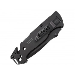 Нож оснащён стеклобоем и встроенным лезвием для быстрой резки шнуров или ремней безопасности, что особенно полезно в экстренных ситуациях. Также предусмотрена функция для зачистки проводов, что добавляет универсальности инструменту.