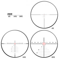Гравированная сетка MOA, расположенная в первой фокальной плоскости, масштабируется вместе с увеличением. Это упрощает внесение поправок, так как сетка остается пропорциональной изображению цели, исключая необходимость дополнительных расчетов.