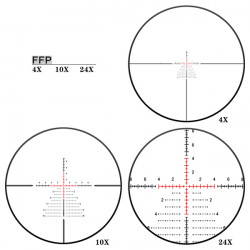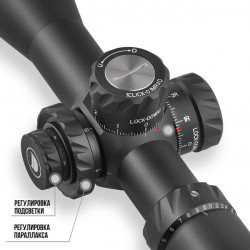 Сетка, выполненная в первой фокальной плоскости (FFP), масштабируется вместе с увеличением, что упрощает расчёт поправок. Подсветка с шестью уровнями яркости делает прицел удобным для использования в условиях слабой освещённости, а тактический маховик регулировки позволяет быстро активировать нужный режим.