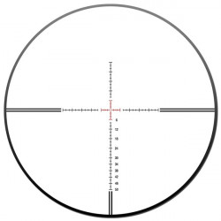 Сетка расположена в первой фокальной плоскости (FFP), благодаря чему её масштабирование синхронизируется с увеличением. Это позволяет сохранять точность расчётов и поправок на любой кратности. Дополнительное преимущество — удобная маркировка в миллирадианах и «ёлочка» ветровых поправок, которая упрощает выполнение повторных выстрелов.