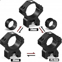 Кольца подходят для оптических прицелов с диаметром 25,4 мм, 30 мм и 34 мм благодаря наличию проставок в комплекте. Это позволяет использовать их с различными моделями прицелов, не приобретая дополнительные аксессуары.