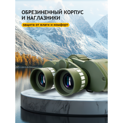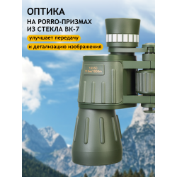 Бинокль оснащен классической Porro-схемой, которая обеспечивает высокую светосилу и объемное изображение. Объективы диаметром 50 мм собирают большое количество света, благодаря чему картинка остается яркой и контрастной даже в сумерках. Это делает прибор особенно полезным для наблюдений в условиях недостаточной освещенности.