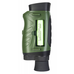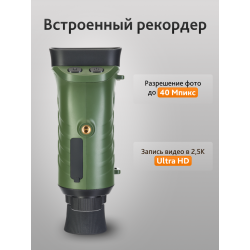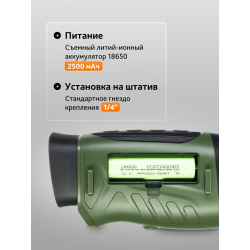 Корпус монокуляра выполнен из высокопрочного ABS-пластика, что делает его устойчивым к повреждениям. Компактный и легкий дизайн позволяет легко держать прибор одной рукой. Для длительных наблюдений предусмотрено крепление на штатив. Питание осуществляется от съемного литий-ионного аккумулятора, который обеспечивает до 4 часов работы в ночном режиме.