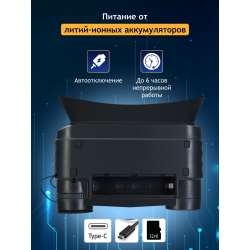 Бинокль предлагает оптическое увеличение 1 крат и цифровое увеличение 2,5 и 3,5 крат, что позволяет детально рассматривать объекты на различных расстояниях. Экран диагональю 2,7 дюйма с разрешением 240x536 пикселей поддерживает три цветовых режима (черно-белый, зеленый и красный), а также четыре уровня яркости, что повышает комфорт использования в разных условиях освещения.