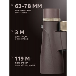 Механизм центральной фокусировки с удобным маховиком позволяет быстро и точно настроить резкость сразу для обеих оптических труб. Минимальная дистанция фокусировки составляет всего 3 метра, что идеально подходит для наблюдений на близких расстояниях.