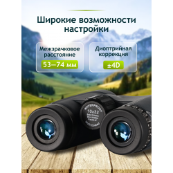Бинокль позволяет настроить межзрачковое расстояние в диапазоне 53–74 мм и корректировать диоптрии от -4 до +4 D. Это обеспечивает максимальный комфорт при использовании, адаптируясь под индивидуальные особенности зрения.