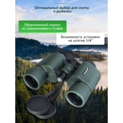 Несмотря на прочную конструкцию, бинокль имеет относительно малый вес, что делает его удобным для длительного использования и транспортировки. В комплект входят чехол, ремешок и защитные крышки, что обеспечивает дополнительный комфорт при переноске.