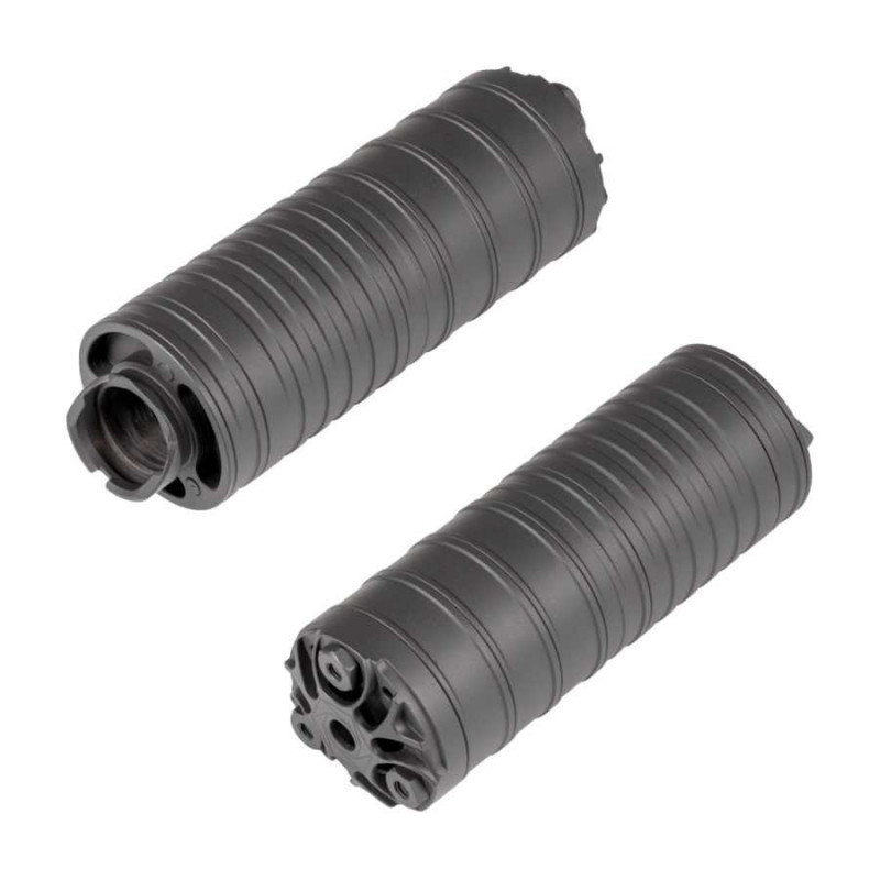 Саундмодератор изготовлен из стали марки 40Х, что гарантирует его долговечность и устойчивость к нагрузкам. При этом облегчённая конструкция минимально влияет на баланс оружия, сохраняя его удобство в эксплуатации.