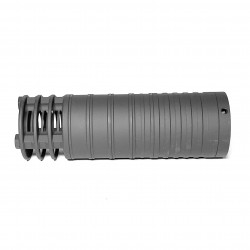 Передняя крышка оснащена стальным рассекателем, который эффективно компенсирует отдачу, подавляет вспышку и дожигает остатки пороха. Это не только улучшает комфорт стрельбы, но и снижает звуковое давление до 137-139 дБ, что делает использование прибора более безопасным для слуха стрелка.