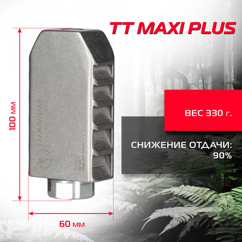 ДТК TT MAXI PLUS имеет размеры 100 мм в длину, 60 мм в ширину и 30 мм в высоту, что делает его компактным и удобным для установки на оружие. Вес устройства всего 330 г, что минимально влияет на общий вес оружия, обеспечивая комфорт при стрельбе и транспортировке.
