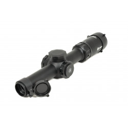 Прицел оснащен объективом диаметром 24 мм и диапазоном увеличения от 1х до 10х, что позволяет адаптироваться под различные условия стрельбы. Широкий угол обзора упрощает сопровождение движущихся целей, а многослойное просветляющее покрытие FMC улучшает видимость даже при слабом освещении. Выходной зрачок вынесен на комфортное расстояние (120–90 мм), что особенно важно при использовании крупнокалиберного оружия.
