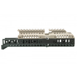 Комплект создан для установки на место штатного цевья. Подходит на АК и карабины на его основе. Имеет направляющую Базис для установки совместимых с ней аксессуаров на цевьё.
