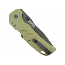 Рукоять выполнена из материала GFN (стеклонаполненного нейлона), который обладает высокой прочностью и устойчивостью к механическим повреждениям. Она обеспечивает надежный хват, даже в условиях повышенной влажности. Зелёный цвет рукояти добавляет стильности и делает нож легко узнаваемым.