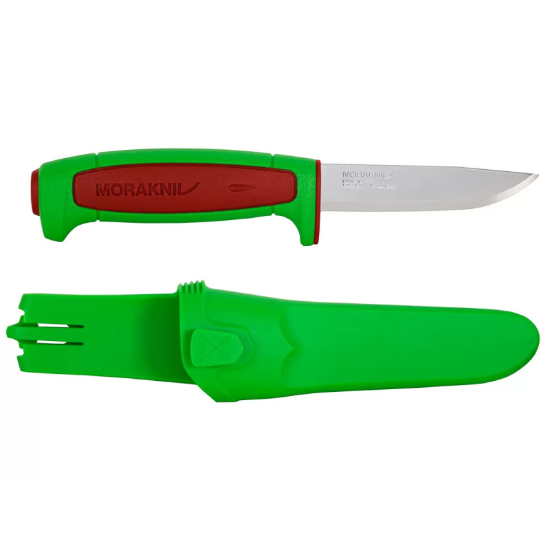 Нож комплектуется полимерными ножнами, которые обеспечивают безопасное хранение и транспортировку. Система Morakniv Smart Button позволяет соединять несколько ножей вместе для удобства использования в различных задачах. Кроме того, ножны оснащены клипсой для крепления на ремень, что делает нож всегда доступным.