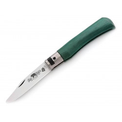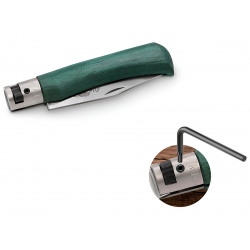 Рукоять ножа изготовлена из ламинированной стабилизированной древесины с зелёным покрытием. Она имеет удобную форму с лёгким изгибом, что обеспечивает надёжный хват и комфортное использование. Латунный больстер добавляет прочности конструкции, защищая рукоять от повреждений при падениях или ударах.