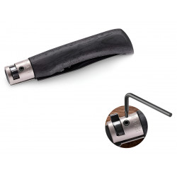 Рукоять изготовлена из стабилизированной ламинированной древесины, которая сочетает в себе прочность и эстетическую привлекательность. Легкий изгиб на «брюшке» обеспечивает комфортный и надежный хват. Природный рисунок и приятная текстура материала добавляют изделию уникальности, а никелированный латунный больстер защищает рукоять от повреждений.