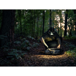 Фонарь оснащён надёжным налобным креплением с двумя эластичными стропами, которые регулируются в двух плоскостях. Конструкция позволяет поворачивать фонарь по вертикали на 180°, а дополнительная фиксация с помощью силиконового кольца обеспечивает устойчивость даже при активных движениях.