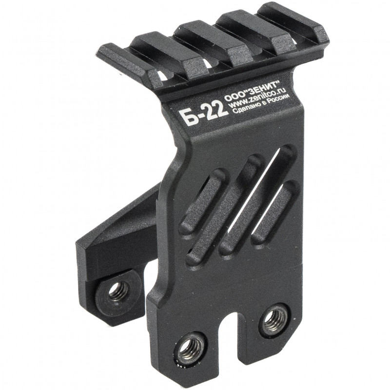 Кронштейн Б-22 от российской компании Зенит предназначен для установки на цевья Б-10М, Б-10У, Б-10Л (в том числе в рамках комплектов Спорт-1 и Спорт-4) Б-21М, Б-21У, Б-21Л (Спорт-2 и Спорт-3), Б-30 и Б-30У за счет чего формирует планку Picatinny над колодкой целика.