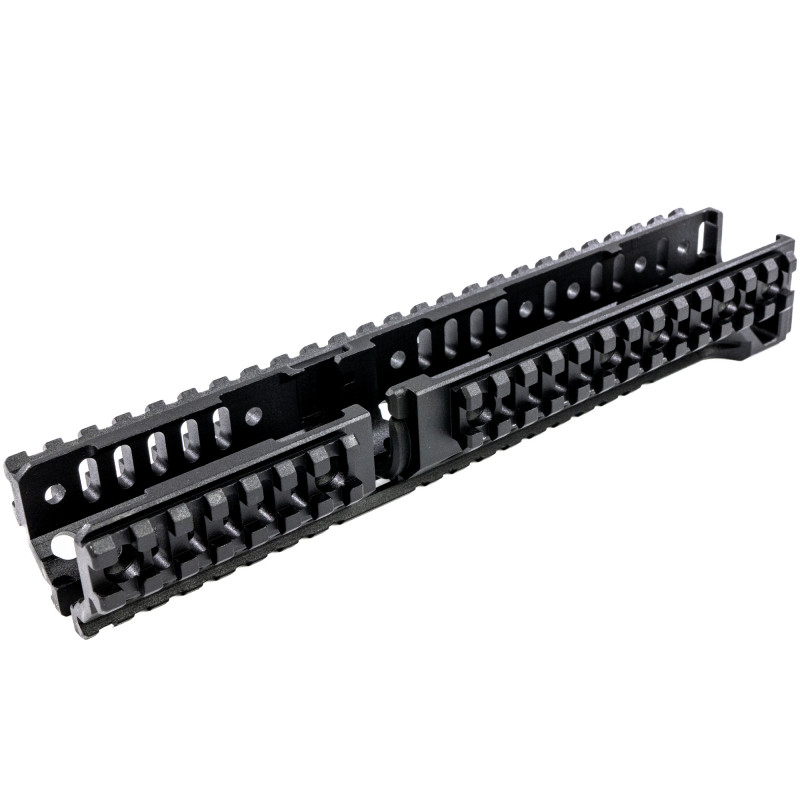 • Оборудован планками Picatinny со всех сторон. Это позволяет установить дополнительный обвес на оружие в любой части цевья: рукоятки, фонари, ЛЦУ, антабки, кронштейны Б-31Б-31СБ-31Н, Б-32, Б-33, Б-22.