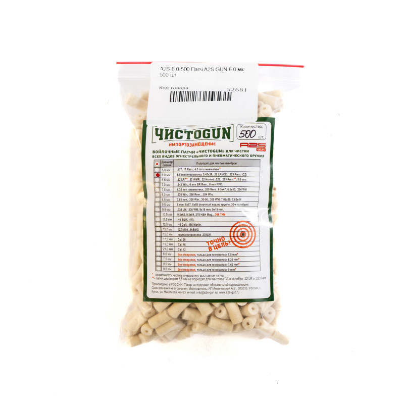 Патчи имеют диаметр 6,0 мм и предназначены для калибров 5,5 мм, 5,45х39, .22 LR, .223 Rem.