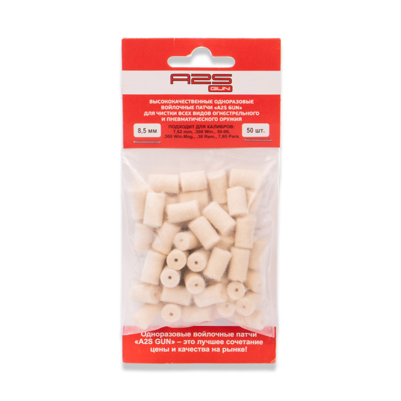Одноразовые войлочные патчи A2S Gun предназначены для чистки оружейного ствола. Для этого необходимо надеть войлочный патч на адаптер шомпола, пропитать патч чистящим средством и потом произвести очистку оружия.